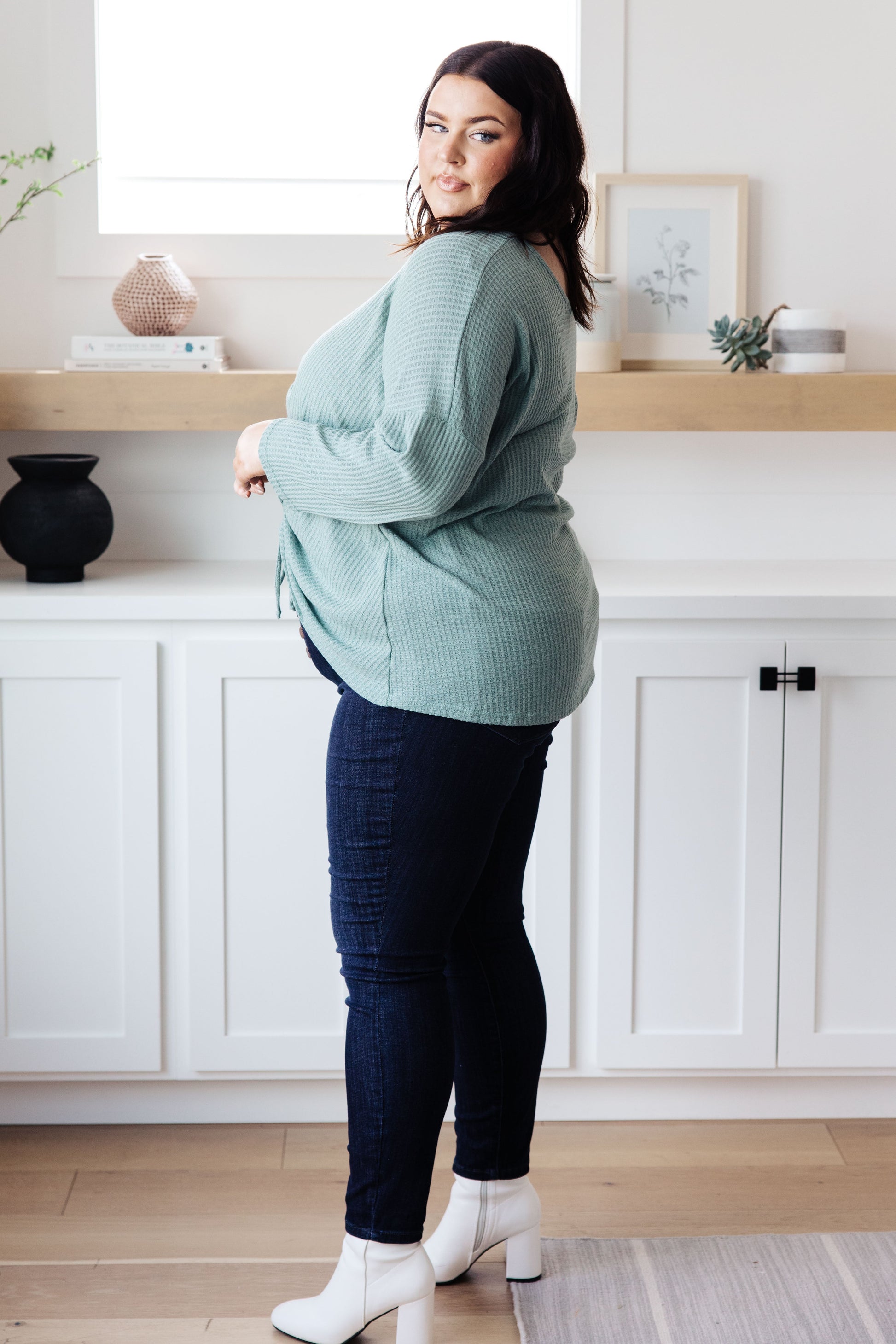 Elevated basics like the Waffle Knit Basic Top In Sage are essential to your year round wardrobe! Lightweight, waffle knit shapes this reversible top. Featuring a round neckline with long dolman sleeves and a rounded hem. The opposite side has a cut out detail that drops into a ruched detail with functional drawstrings.